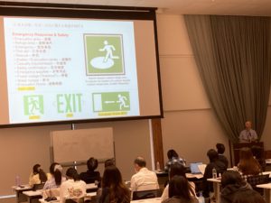 第2部では、ミニ英会話講座「MICE開催時の災害英会話」と題し、災害・天気に関する単語や、日本と海外(欧米)の災害対応の違いについて学びました。その後、参加者同士でグループを作り、国際会議参加者に対して発災時に英語でどの様に対応するか、実践演習を行いました。
